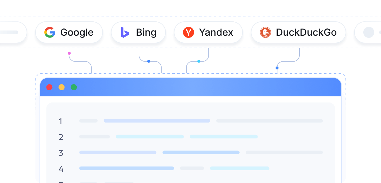 一站式接入Google、Bing、Yandex、DuckDuckGo等全球主流搜索引擎,数据全面可靠,提供真实可靠的搜索数据解决方案。